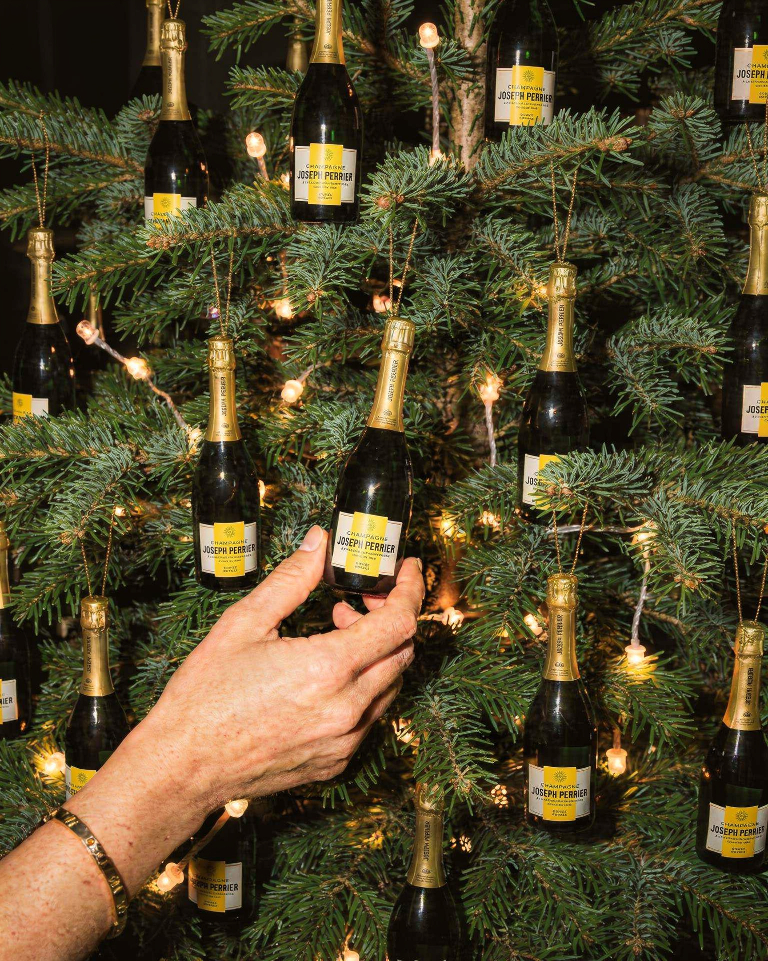 Nous avons imaginé une atmosphère chaleureuse, inspirée d’un réveillon élégant, avec une table dressée, un sapin décoré, des mini-bouteilles détournées en ornements, des verres qui s’entrechoquent et des sourires spontanés.